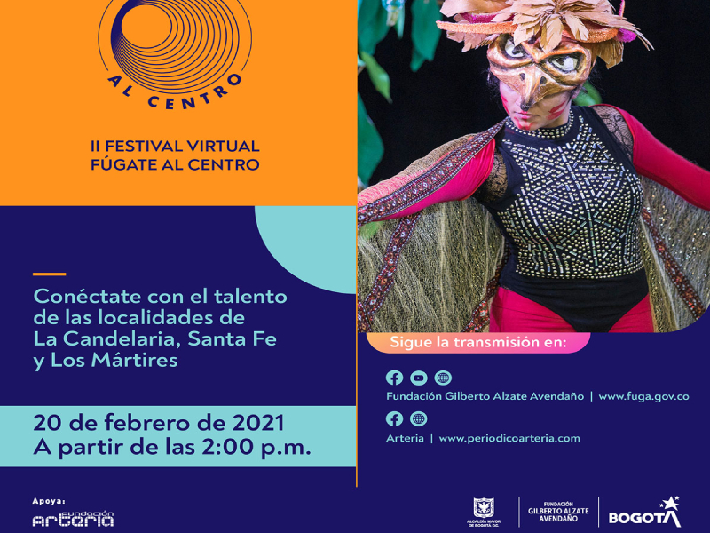 Con el objetivo de reactivar el sector artístico y cultural del centro de Bogotá y fomentar la circulación de las artes escénicas y musicales en la coyuntura actual, la Fundación Gilberto Alzate Avendaño (FUGA) realizará la segunda versión del Festival Virtual Fúgate al Centro con la participación de siete artistas y agrupaciones, el sábado 20 de febrero a partir de las 2:00 p.m. La transmisión se llevará a cabo a través de la página de Facebook y del canal de YouTube de la FUGA.