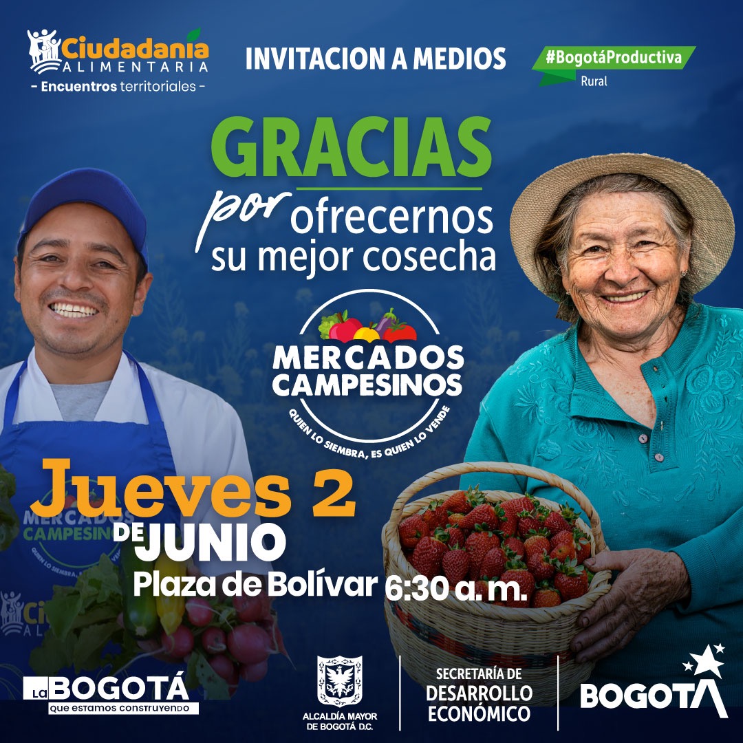 ● Después de dos años de pandemia, el 2, 3, 4 y 5 de junio se llevará a cabo el Gran Mercado Campesino en la Plaza de Bolívar, para conmemorar el Día del Campesino.